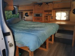 Coming from Martinique this van was the realization of a dream and allowed me to live in it for 2 years and has remained my only vehicle for 6 years now. the layout is not new, traces of wear, a few addicts on the bodywork, it has already rolled its bump well... BUT! retains the charm of a HOMEMADE layout, ALL IN WOOD, with a very comfortable BED of 1m90x 1m20, a real small boat cabin with AUTONOMY IN WATER...